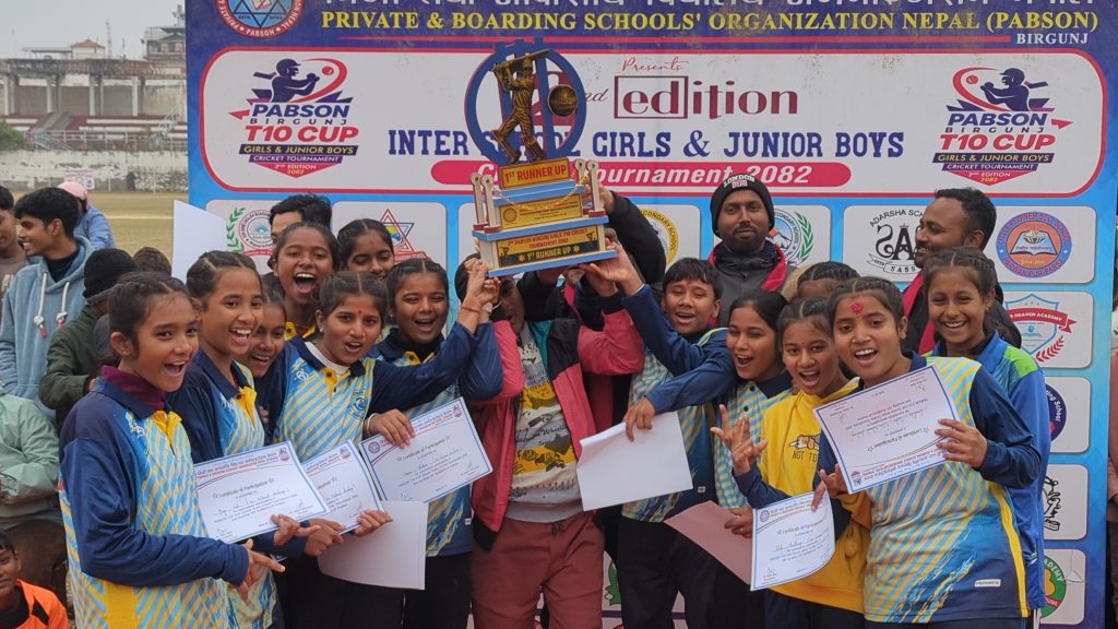 निजी तथा आवासीय विद्यालय सङ्गठन (प्याब्सन) वीरगञ्जको आयोजनामा सञ्चालन भइरहेको दोस्रो संस्करणको प्याब्सन टी–१० गर्ल्स एन्ड जुनियर बोयज क्रिकेट प्रतियोगिता अन्तर्गत फाइनल खेल मंगलबार सम्पन्न भएको छ।