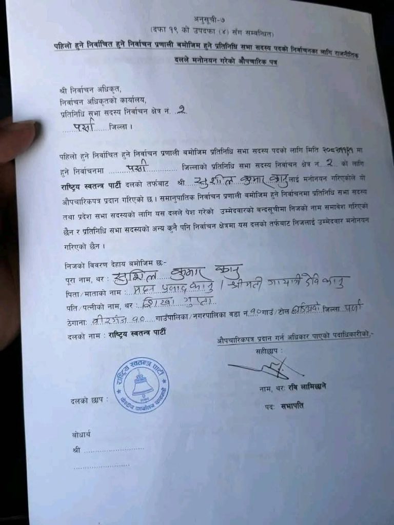 राष्ट्रिय स्वतन्त्र पार्टी (रास्वपा) ले पर्सा क्षेत्र नम्बर २ बाट युवा नेता सुशीलकुमार कानुलाई उम्मेदवार बनाएको छ।