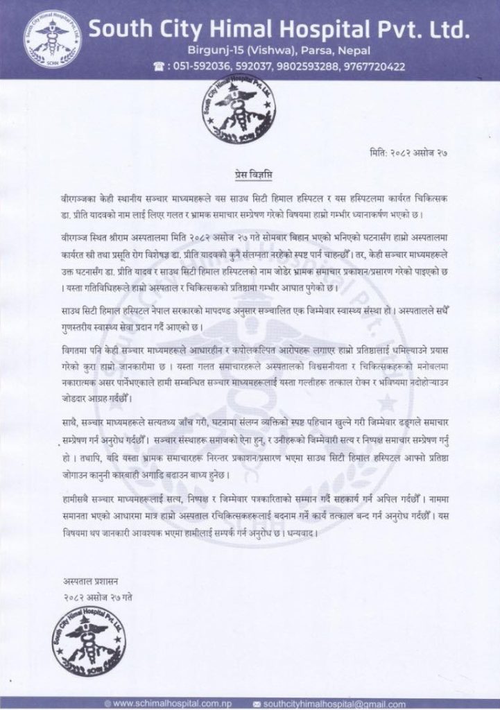 वीरगञ्जस्थित साउथ सिटी हिमाल हस्पिटलले केही स्थानीय सञ्चार माध्यमहरूले अस्पताल र त्यहाँ कार्यरत स्त्री तथा प्रसूति रोग विशेषज्ञ डा. प्रीति यादवको नाम जोडेर प्रकाशित/प्रसारित गरेको भ्रामक समाचारप्रति कडा आपत्ति जनाएको छ।
